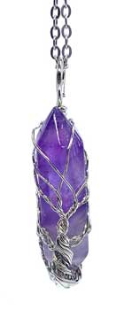 The detailed wire wrapping creates a tree of life design around the amethyst crystal. The piece of amethyst is polished and double-terminated. The pendant measures 2" and is hung on a 20" silver-toned chain. Sizes may vary slightly.