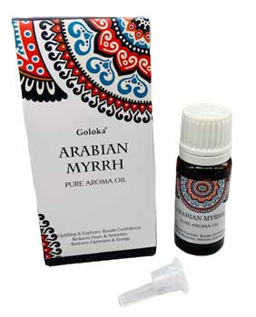 Arabian myrrh goloka pure aroma oil is uplifting and euphoric, boosts confidence, reduces fear and anxiety, and restores energy and optimism. Each bottle of this oil offers you an enlightening and transcendental aromatic experience. Pure aroma oils can be used for vaporization and diffusing and not for application on the skin. External use only. Full boxes of 12 oils offer a display box. 10ml sold individually and from India.