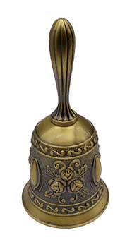 This handbell is rich with ornate detailing and offers a sweet chime. The design wraps around the entire bell and extends up the handle. 4 1/2" tall bell.