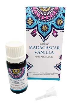 Madagascar vanilla Goloka pure aroma oil recharges the atmosphere and replenishes and restores energy levels. Each bottle of this oil offers you an enlightening and transcendental aromatic experience. Pure aroma oils can be used for vaporization and diffusing and not for application on the skin. External use only. Full boxes of 12 oils offer a display box. 10ml sold individually and from India.
