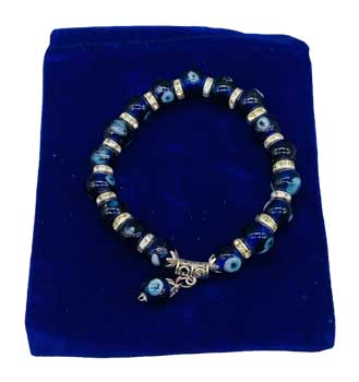 An 8mm beaded bracelet with several evil eyes separated by faceted spacers. A single evil eye bead hangs from the center attached to silvertone hardware.