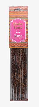 Madre Tierra rose incense sticks. Visible resin and botanical grains on each hand-rolled stick. These come beautifully packaged with 8 high-quality sticks per pack. 12 individual packs per case.
