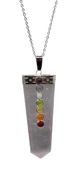 Allow the selenite to keep your vibration high and your energy clean, while you wear this chakra pendant. Complete with small stones down the front to help keep you in alignment. Comes with a 20" chain, with a pendant measuring approximately 3" long.