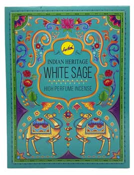 15 Gm White Sage Incense Sticks Indian Heritage. Indian heritage white sage stick incense. Beautifully packaged box containing approximately 15 premier quality high perfume incense sticks. From India and free from chemicals and toxic agents. 12 individual boxes per case.